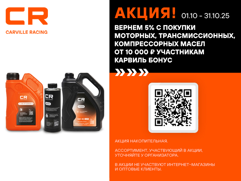 Вернем 5% участникам Карвиль бонус за покупку моторных, трансмиссионных, компрессорных масел на сумму от 10 000 руб.