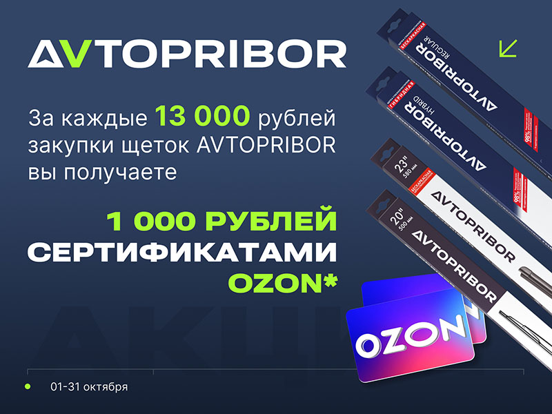 За каждые 13 000 рублей закупленных щеток (гибридные, бескаркасные) в подарок сертификат Озон 1 000 рублей.